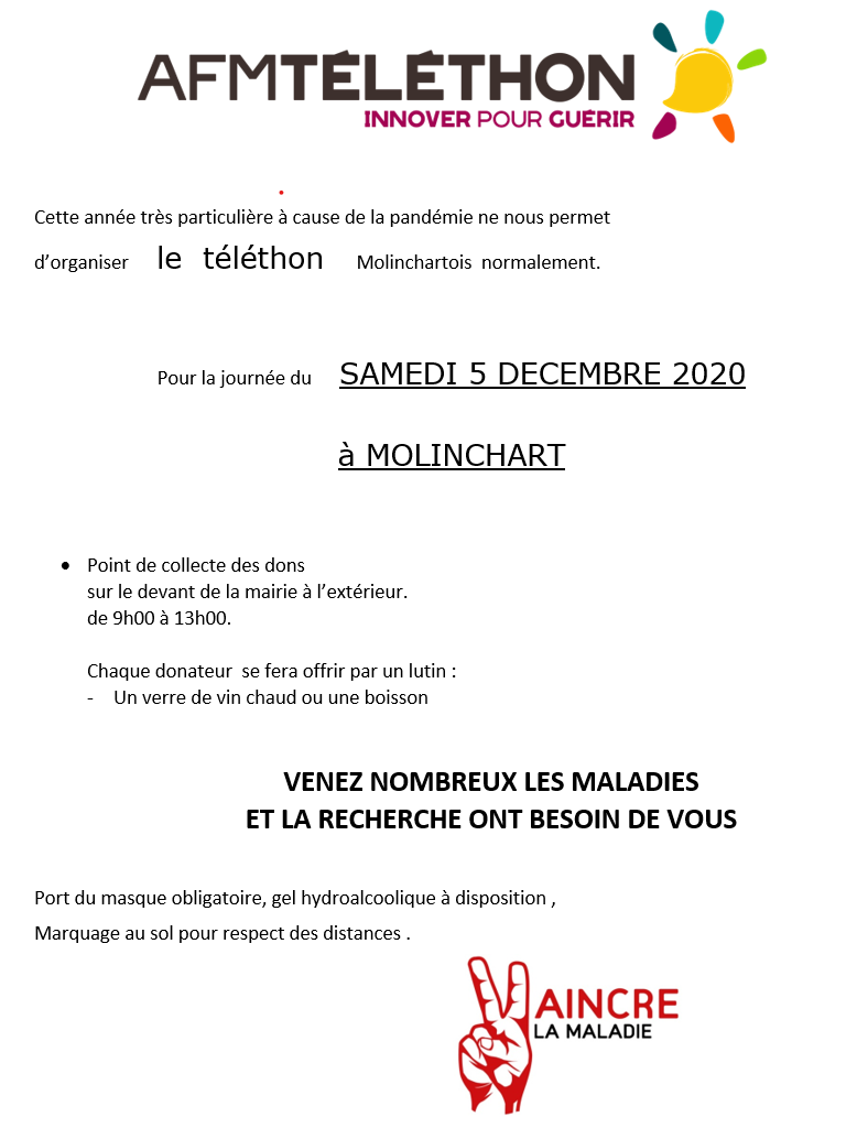 Cette année très particulière, à cause de la pandémie, ne nous permet pas d’organiser le téléthon Molinchartois normalement.