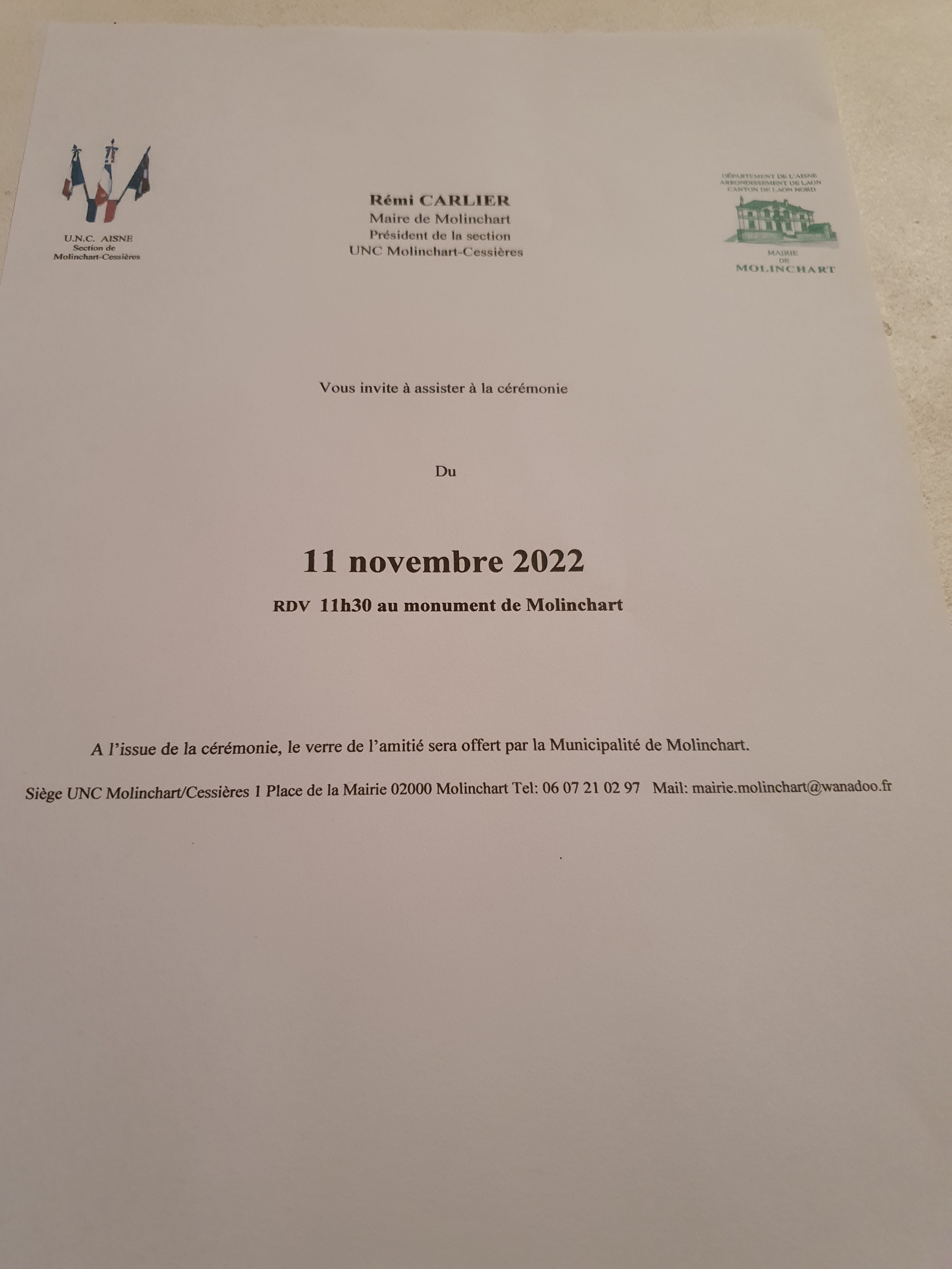 Monsieur Rémi CARLIER, maire de Molinchart et président de la section UNC Molinchart-Cessières, vous invite à assister à la cérémonie du 11 novembre 2022 à 11h30 au monument aux morts de Molinchart.