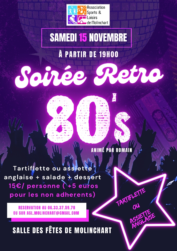 Préparez vos plus belles tenues fluo et vos pas de danse ! L’Association Sports et Loisirs de Molinchart vous invite à une soirée exceptionnelle sur le thème des années 80. Le samedi 15 novembre 2025 à partir de 19h ? Salle des fêtes de Molinchart ? Réservation obligatoire !